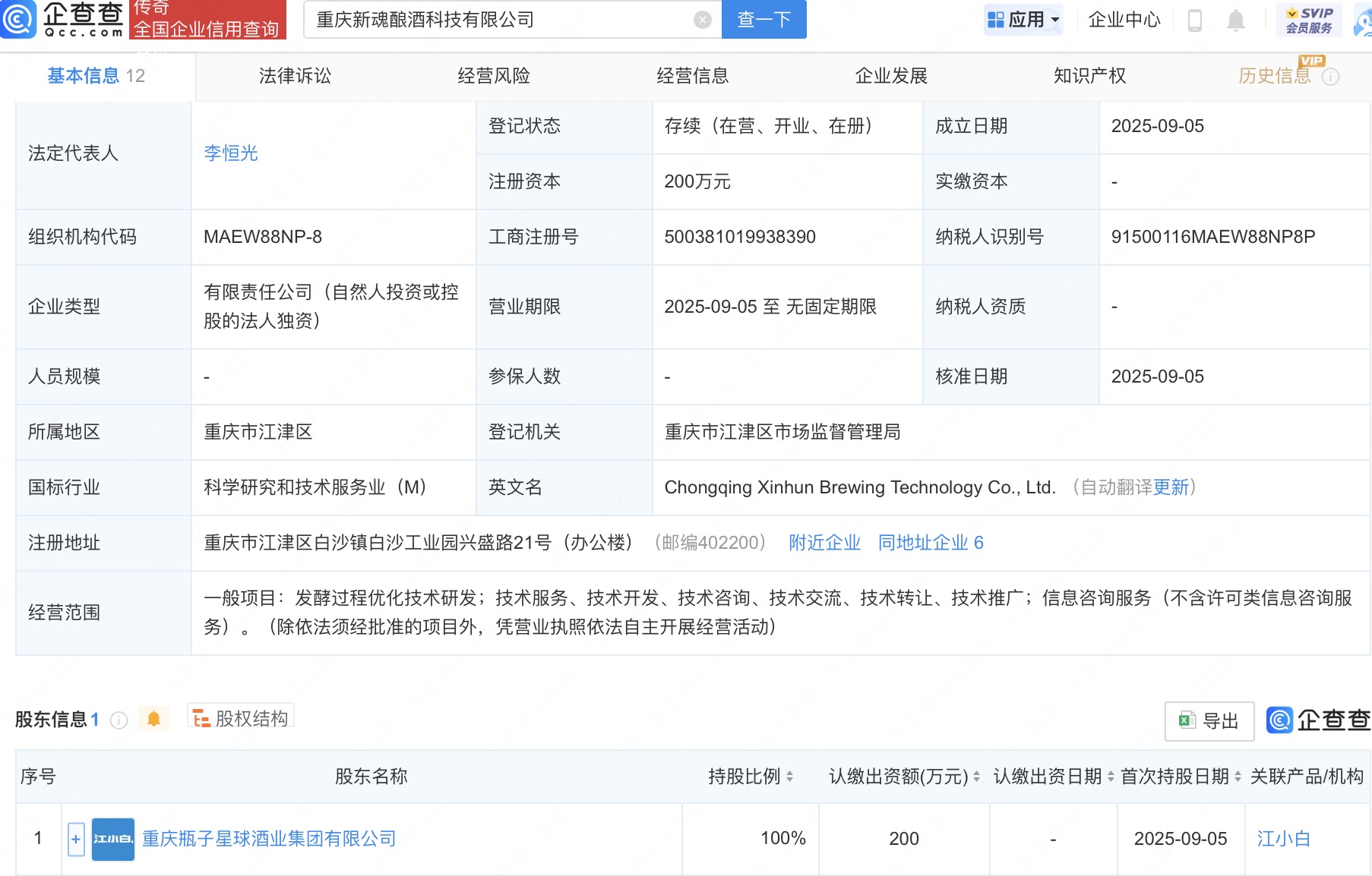 近日,重庆新魂酿酒科技有限公司成立,法定代表人为李恒光,注册资本200万人民币,经营范围为发酵过程优化技术研发,技术服务、技术开发、技术咨询、技术交流、技术转让、技术推广,信息咨询服务。企查查股权穿透显示,该公司由江小白关联公司重庆瓶子星球酒业集团有限公司全资持股。